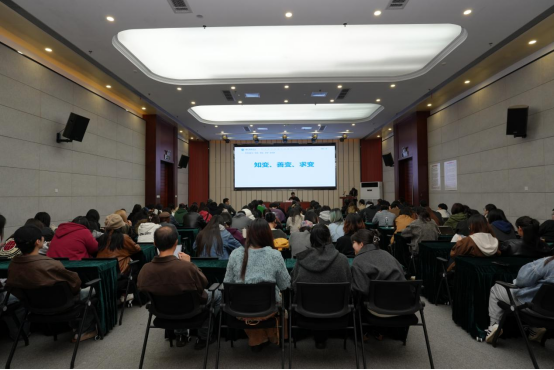 课堂上,曹丹从艺术创新与“知变、善变、求变”的关系出发,围绕艺术创新与时代需求,系统阐述研究生教育的变革方向与艺术教育的社会赋能路径。他指出,当前中国研究生教育正经历从“规模增长”向“内涵重塑”的时代之变。具体表现为目标从培养“专业人才”转向塑造“创新引擎”,范式从“学科分立”转为“跨界融合”,角色从“象牙塔”拓展为“社会服务器”。面对需求之变,研究生需从“技能持有者”成长为“问题解决者”,从“被动执行者”转变为“主动建构者”,并具备本土情怀与全球视野。